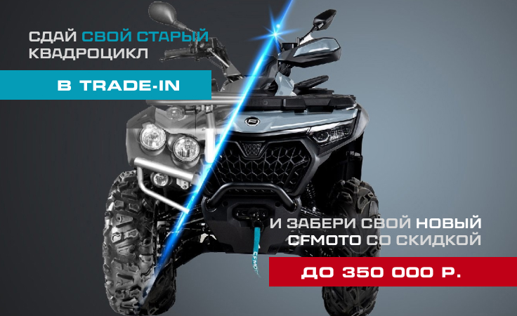 Согласно условиям Программы, Вы можете сдать Дилеру CFMOTO в зачет на условиях «TRADE-IN» любой квадроцикл ATV или мотовездеход Side-by-Side любого бренда с объемом двигателя свыше 350сс и имеющий ПСМ, при этом Дилер оценивает б/у квадроцикл с учетом его износа и рыночной стоимости и снижает на эту сумму цену на выбранный клиентом новый квадроцикл CFMOTO. Кроме этого, Покупатель получает дополнительную скидку, указанную в таблице: